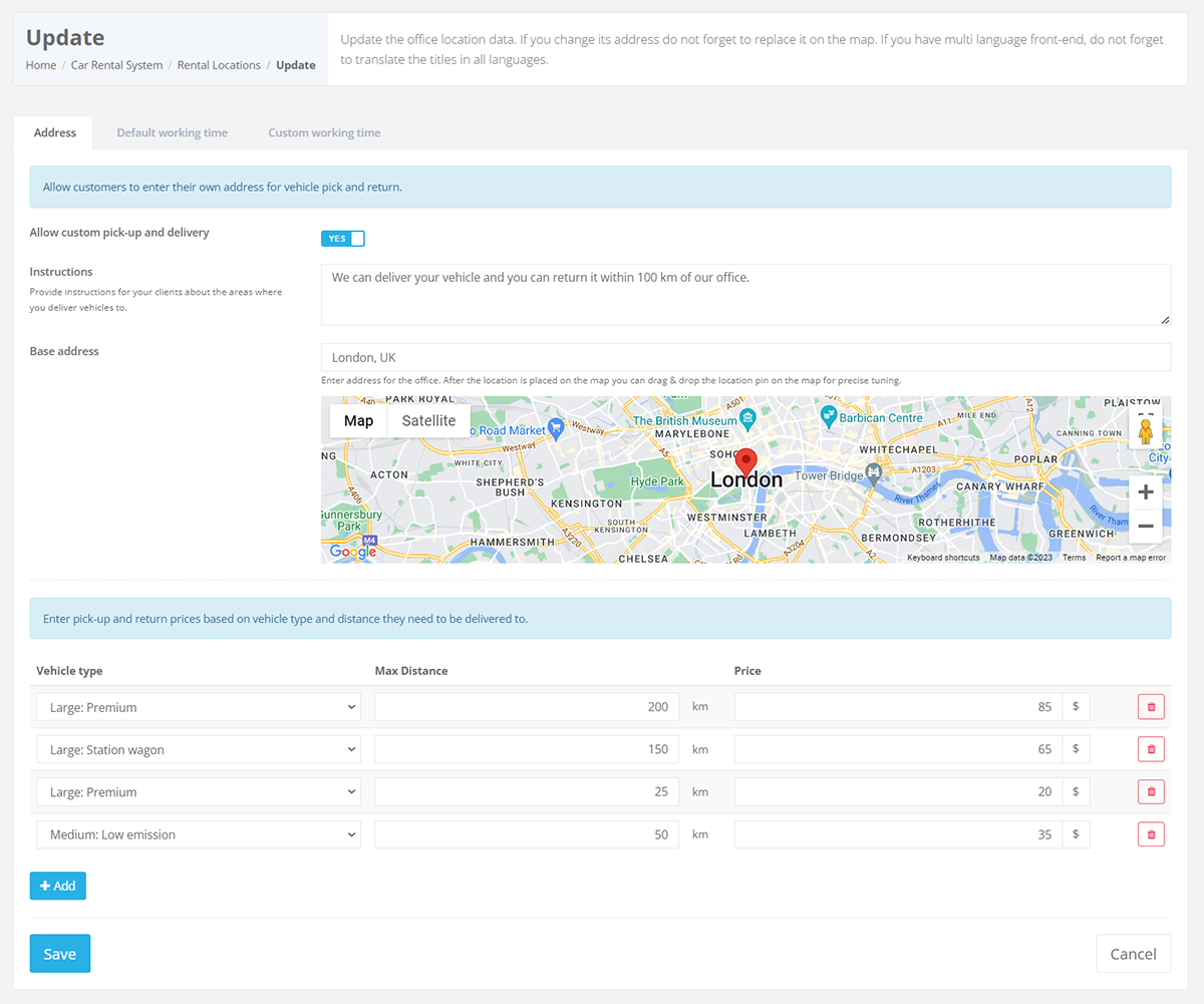 Set your working hours according to the high demand during certain hours or on specific dates for each location, and charge clients extra for pick-ups and returns during non-working hours. For any location, you can also set a custom working time.