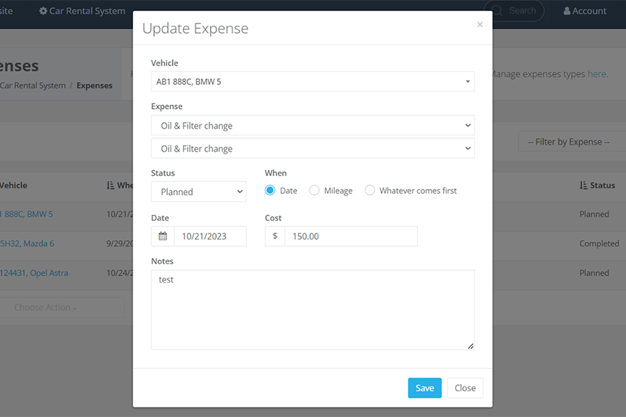 Streamline fleet expense management with the car rental business software from VEVS. Record expense details - dates, categories, types, costs, and statuses (planned, cancelled, or completed) - for effortless tracking and control.